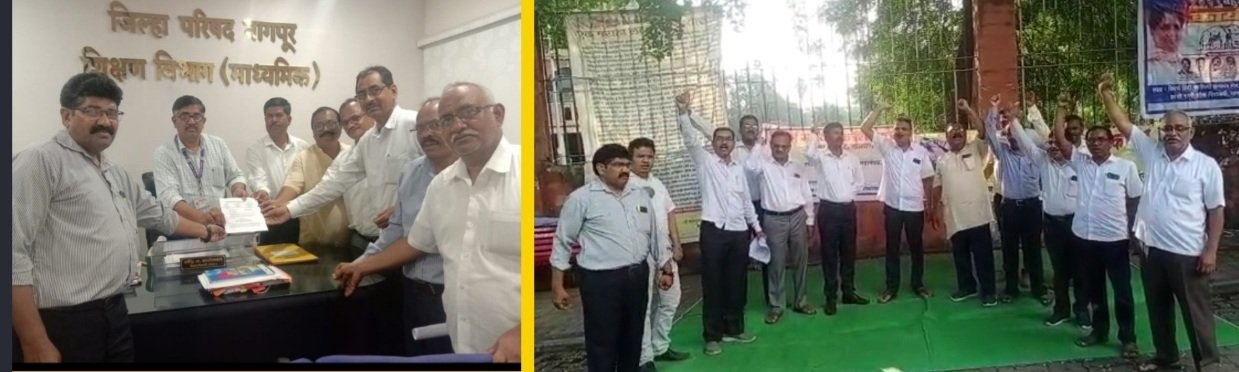 नागपूर येथे दिनाक. 1 सप्टेंबर 2022 :- विदर्भ माध्यमिक शिक्षक संघाचे आंदोलन, संविधान चौक येथील आज गुरूवारी 1 सप्टेंबर रोजी, विदर्भ माध्यमिक शिक्षक संघ नागपूर च्यावतीने आमदार प्रशांत बंब यांनी विधानसभेत शिक्षकांचे संदर्भात केलेले अपमान कारक वक्तव्य याचा निषेध व शिक्षकांचे शाळेत फोटो लावण्याचा शासकीय आदेश याचा निषेध करण्याकरीता संविधान चौक नागपूर येथे सायं. 4 ते 5 या वेळेत तीव्र निदर्शने करण्यात आली. या नंतर शिक्षणाधिकारी मा. काटोलकर यांच्या मार्फत शिक्षण मंत्र्याच्या नावे निवेदन पाठविण्यात आले. या आंदोलनाचे नेतृत्व विमाशिसंघ नागपूरचे अध्यक्ष विठ्ठल जुनघरे यांनी केले. यावेळी आंदोलनात अविनाश बडे, दिलीप बोके, रमेश काकडे, संजय वारकर, प्यारेलाल लोणारे, राजेश गौरे, राकेश दुम्पलवार, वामन सोमकुंवर, देवराव मांडवकर व अनेक कार्यकर्ते उपस्थित होते.