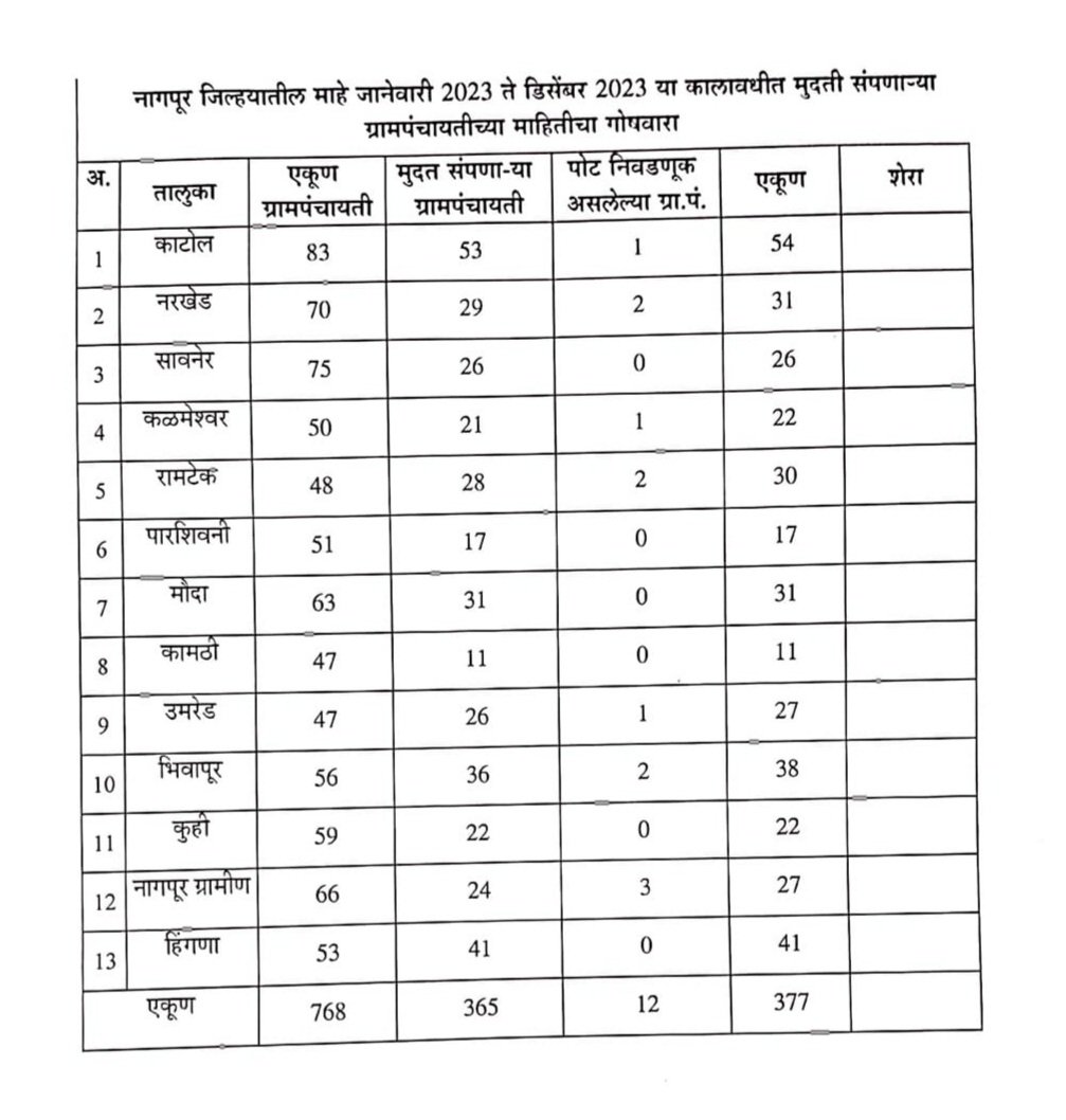नागपूर दि. 4 ऑक्टोंबर 2023 : - नागपूर जिल्ह्यातील ३६५ ग्रामपंचायतमध्ये पाच नोव्हेंबरला ग्रामपंचायतची निवडणूक होणार आहे. तर बारा ग्रामपंचायतीमध्ये पोटनिवडणुका होणार आहेत.