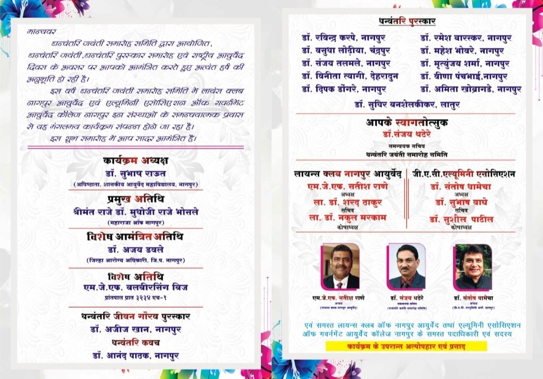 धन्वंतरी जयंती, धन्वंतरी पुरस्कार आणि राष्ट्रीय आयुर्वेद दिन कार्यक्रम, शुक्रवार,10 नोव्हेंबर, रोजी दुपारी 2.30 वाजता नागपूर येथे आयोजन