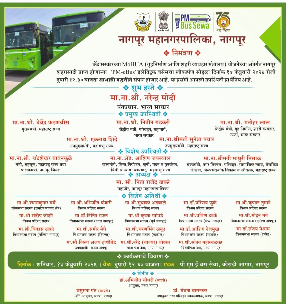 नागपूर, ता.14 फेब्रुवारी 2026 : नागपूरात आज केंद्र सरकारच्या पी.एम. ई-बस (PM e-Bus) सेवा अंतर्गत नागपूर महानगरपालिकेच्या आपली बसच्या ताफ्यात अत्याधुनिक आणि पूर्णपणे वातानुकूलित अशा ५० इलेक्ट्रिक बसेस दाखल होणार आहेत. देशाचे मा.पंतप्रधान श्री. नरेन्द्र मोदी यांच्या हस्ते शनिवार १४ फेब्रुवारी रोजी दुपारी १२.३० वाजता पी.एम.ई-बस सेवा कोरा डी आगार येथे आभासी पद्धतीने या बसेसचे लोकार्पण केल्या जाणार आहे.