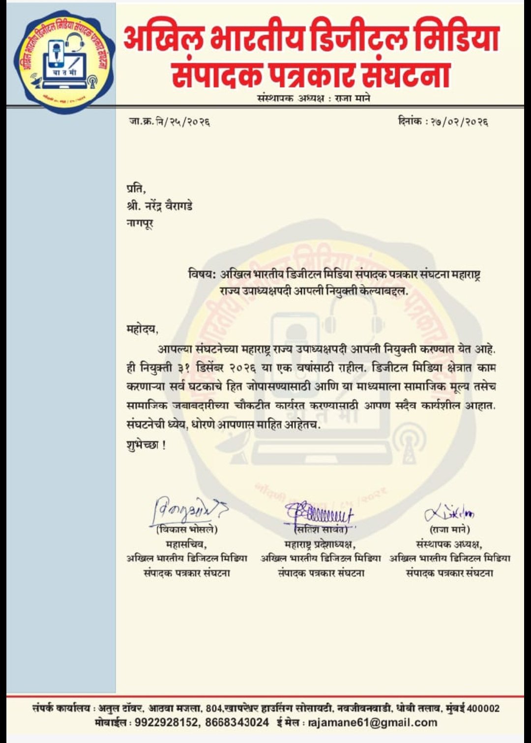 पत्रकार, नरेंद्र वैरागडे यांची अखिल भारतीय डिजिटल मिडिया संपादक पत्रकार संघटना. च्या राज्य उपाद्यक्ष पदी नियुक्ती करण्यात आली
